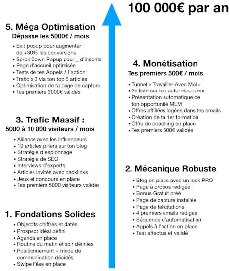 C'est comme retourner sur les bancs de l'école et suivre un cursus qui te dévoile étape par étape quoi faire et surtout... dans quel ordre le faire, pour atteindre 50 000€ par an, puis monter à 100 000€ par an.