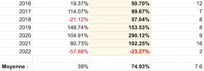 1. Moyenne par an en appliquant ma méthode = 74.93% (résultats basés sur mes backtests de 2000 à 2022)