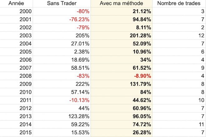 La première année négative était en 2008 avec - 8.90% en utilisant ma méthode, contre - 83% sans trader.